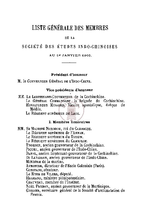 Title : List of members of the Society of Indochinese Studies as of 1st January 1900
