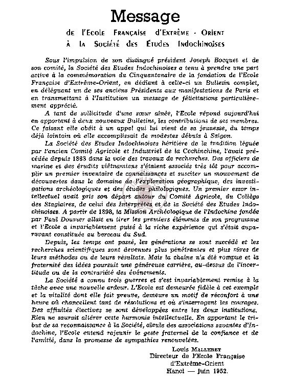 Title : Message from the Ecole Française d'Extrême-Orient to the Society of Indochinese Studies
