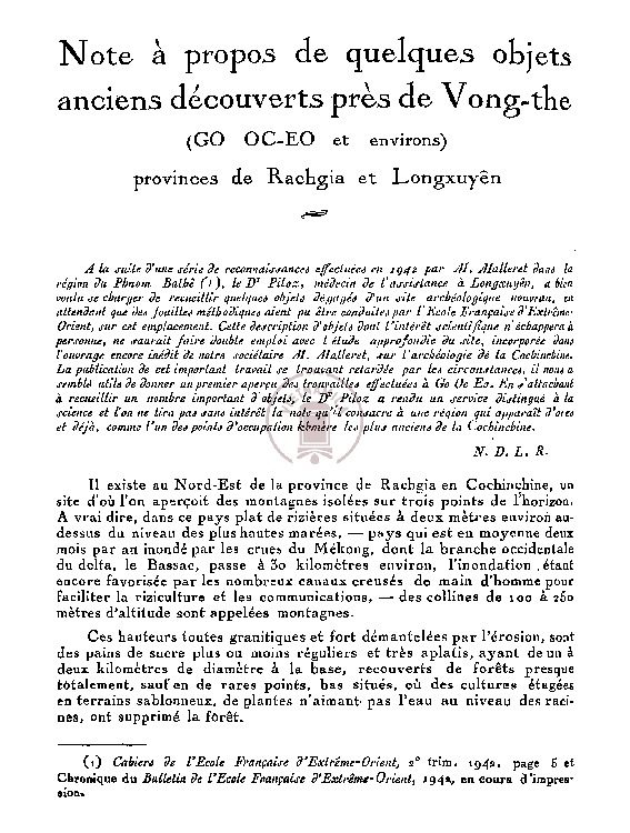 Đề mục : Ghi chép về một số cổ vật phát hiện ở Vọng Thê (gò Ốc Eo và vùng phụ cận) ở các tỉnh Rạch Giá và Long Xuyên